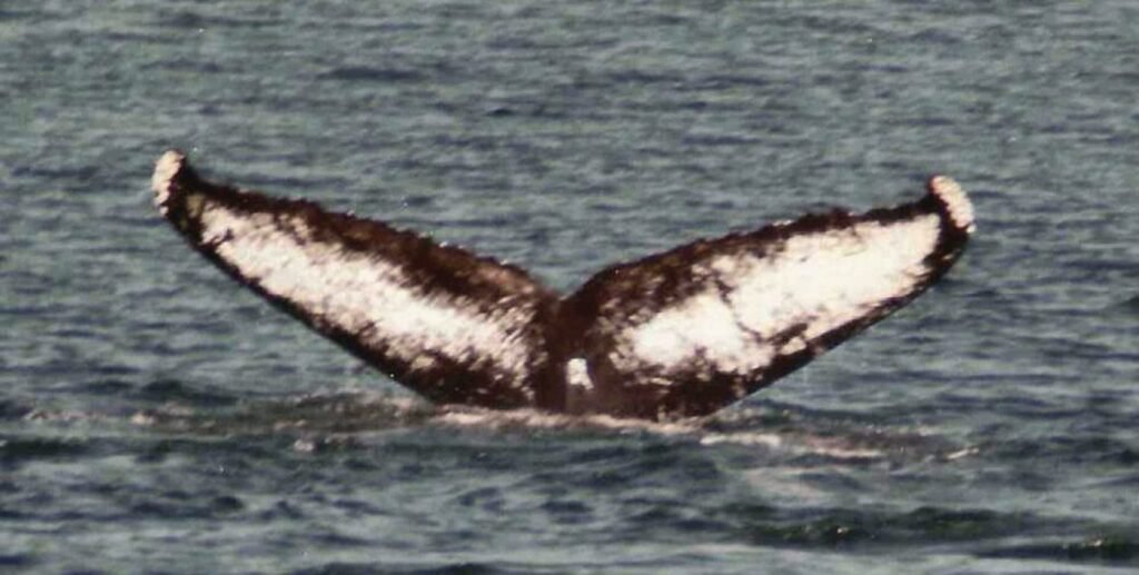 Sirius earned his name from the bright, circular white marking in the center of his tail flukes, evoking Sirius—the brightest star in the night sky (also known as the Dog Star). Like many Gulf of Maine humpbacks, he bears scars from past entanglements in fishing gear, a common threat in these busy waters. You can see one cut in his tail stock.